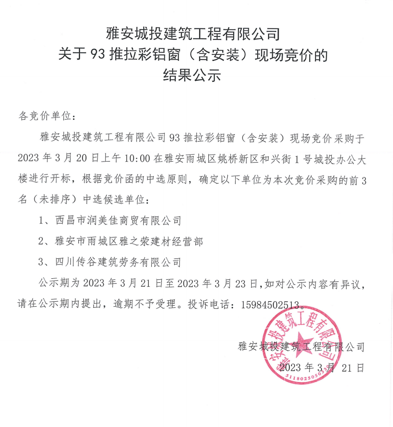 雅安城投建筑工程有限公司關(guān)于93推拉彩鋁窗(含安裝)現(xiàn)場競價(jià)的結(jié)果公示