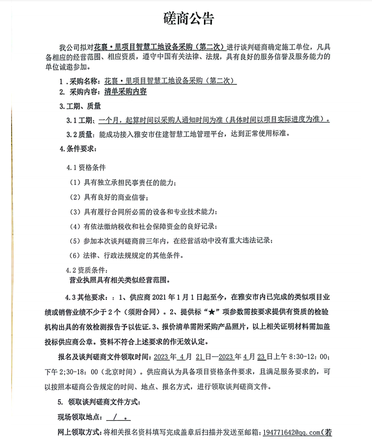 花襄·里項(xiàng)目智慧工地設(shè)備采購(gòu)(第二次)談判磋商公告