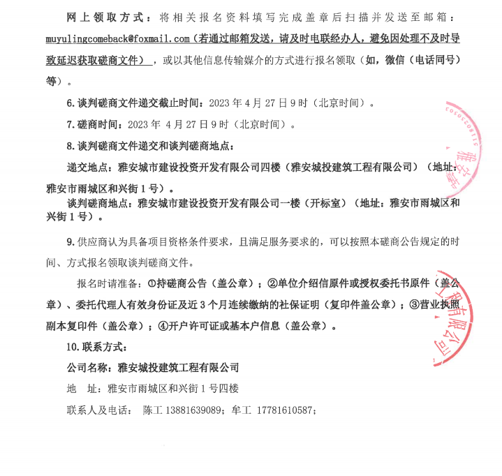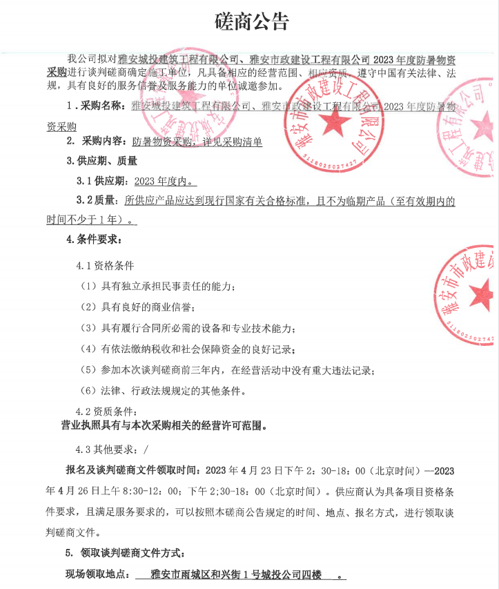 雅安城投建筑工程有限公司、雅安市政建設(shè)工程有限公司2023年度防暑物資采購(gòu)談判磋商公告