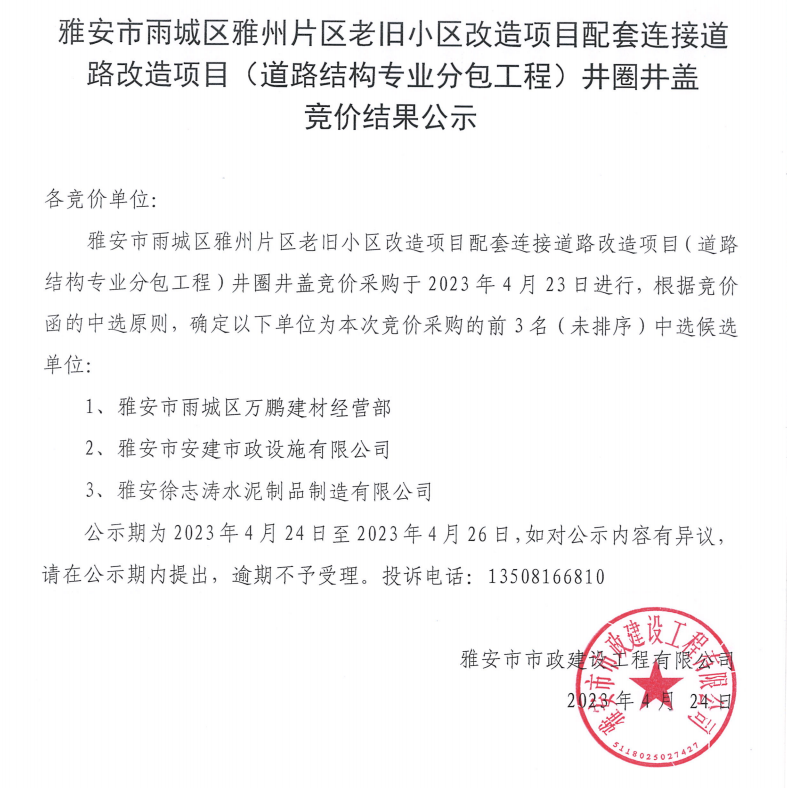 雅安市雨城區(qū)雅州片區(qū)老舊小區(qū)改造項目配套連接道路改造項目(道路結(jié)構(gòu)專業(yè)分包工程)井圈井蓋競價結(jié)果公示