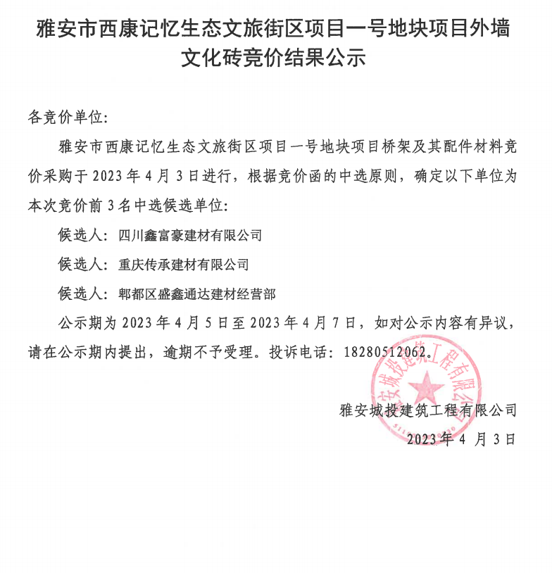 雅安市西康記憶生態(tài)文旅街區(qū)項目一號地塊項目外墻文化磚競價結果公示