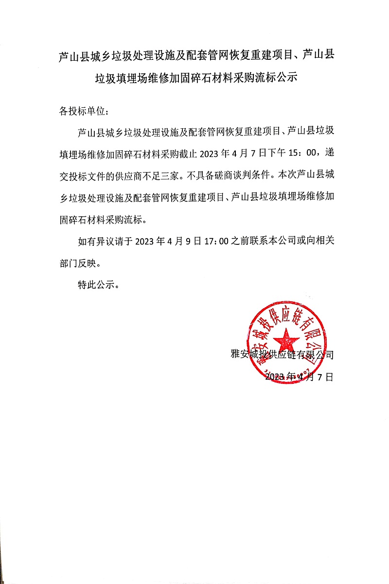 蘆山縣城鄉(xiāng)垃圾處理設施及配套管網(wǎng)恢復重建項目、蘆山縣垃圾填埋場維修加固碎石材料采購流標公示