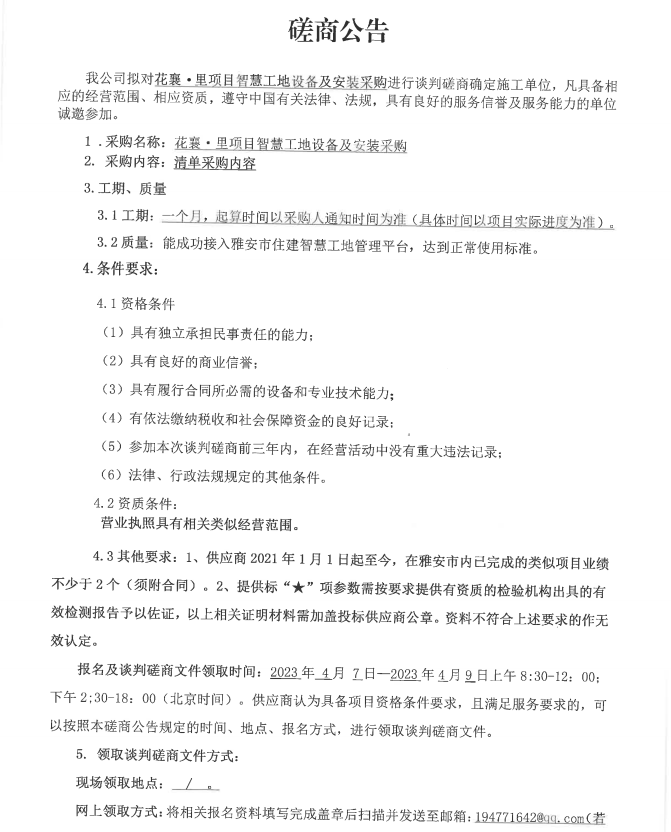花襄·里項(xiàng)目智慧工地設(shè)備及安裝采購磋商公告