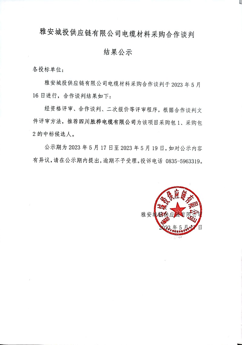 雅安城投供應鏈有限公司電纜材料采購合作談判結(jié)果公示