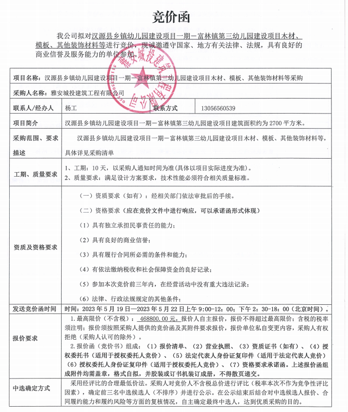 漢源縣鄉(xiāng)鎮(zhèn)幼兒園建設(shè)項目一期一富林鎮(zhèn)第三幼兒園建設(shè)項目木材、模板、其他裝飾材料等采購競價公告