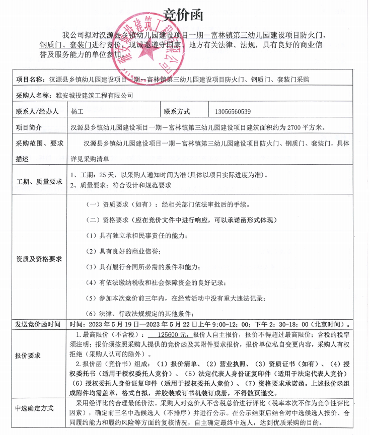 漢源縣鄉(xiāng)鎮(zhèn)幼兒園建設(shè)項(xiàng)目一期一富林鎮(zhèn)第三幼兒園建設(shè)項(xiàng)目防火門、鋼質(zhì)門、套裝門采購競價(jià)公告