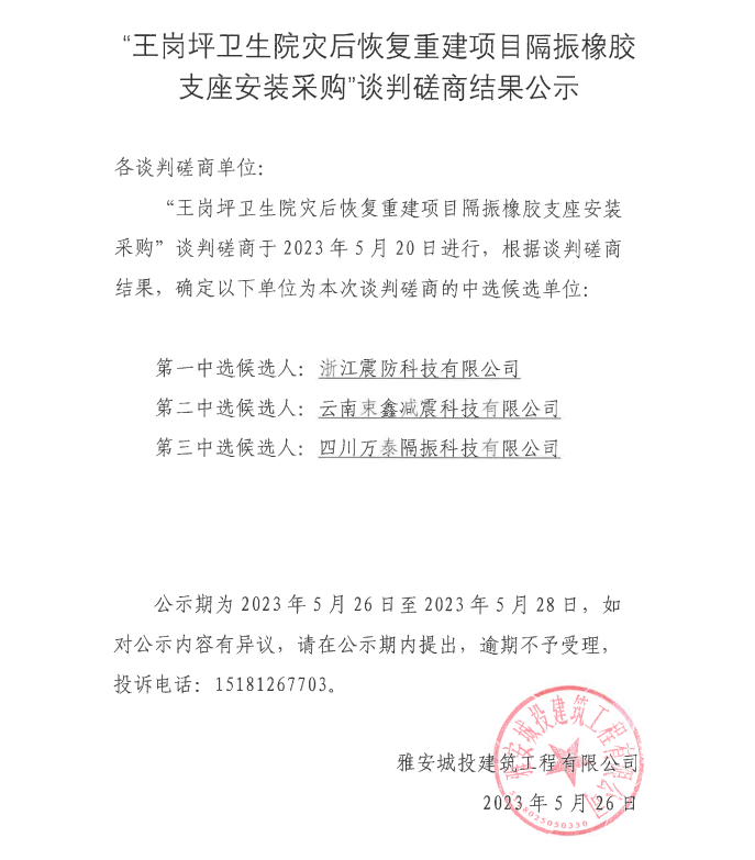 “王崗坪衛(wèi)生院災(zāi)后恢復(fù)重建項(xiàng)目隔振橡膠支座安裝采購(gòu)”談判磋商結(jié)果公示