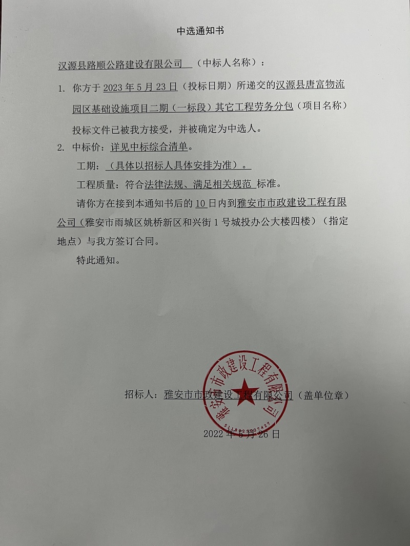 漢源縣唐富物流園區(qū)基礎(chǔ)設(shè)施項目二期(一標段)其它工程勞務(wù)分包中選通知書