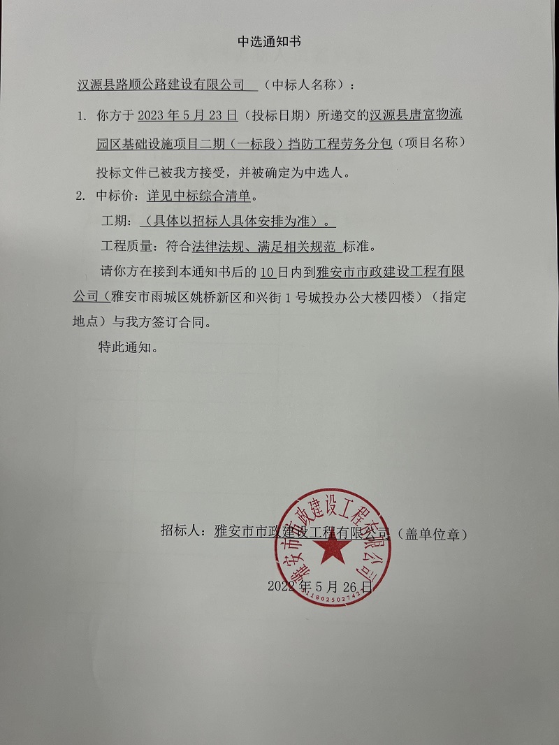 漢源縣唐富物流園區(qū)基礎(chǔ)設(shè)施項(xiàng)目二期(一標(biāo)段)擋防工程勞務(wù)分包中選通知書(shū)