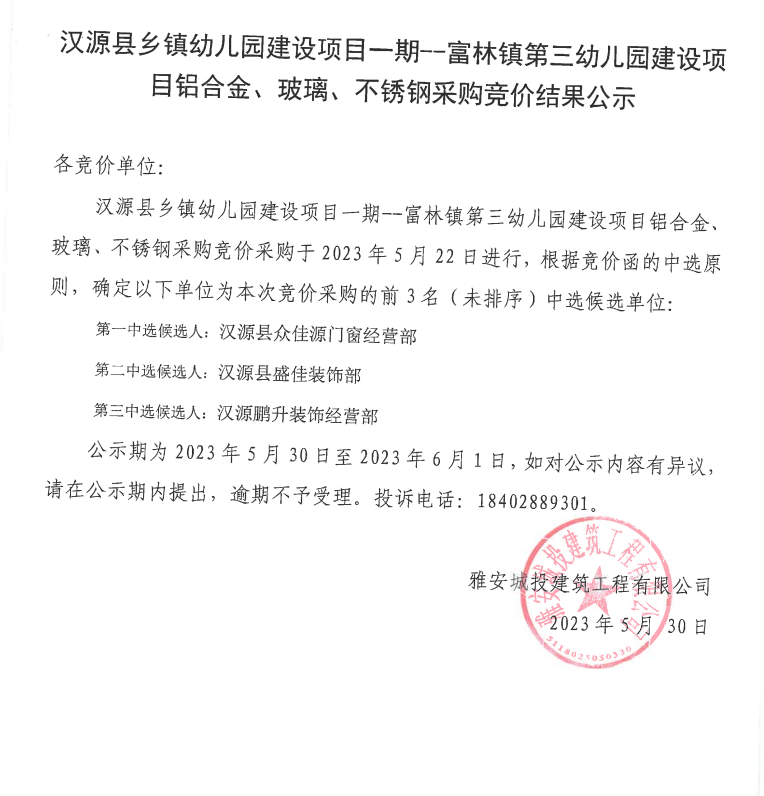 漢源縣鄉(xiāng)鎮(zhèn)幼兒園建設項目一期--富林鎮(zhèn)第三幼兒園建設項目鋁合金、玻璃、不銹鋼采購競價結(jié)果公示