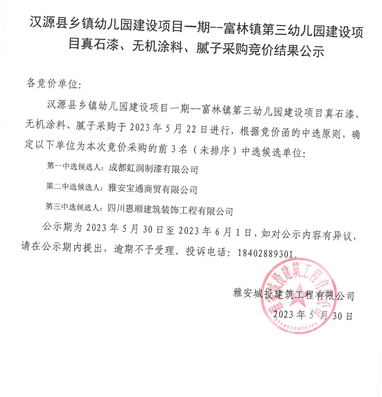 漢源縣鄉(xiāng)鎮(zhèn)幼兒園建設(shè)項(xiàng)目一期--富林鎮(zhèn)第三幼兒園建設(shè)項(xiàng)目真石漆、無機(jī)涂料、膩?zhàn)硬少徃?jìng)價(jià)結(jié)果公示