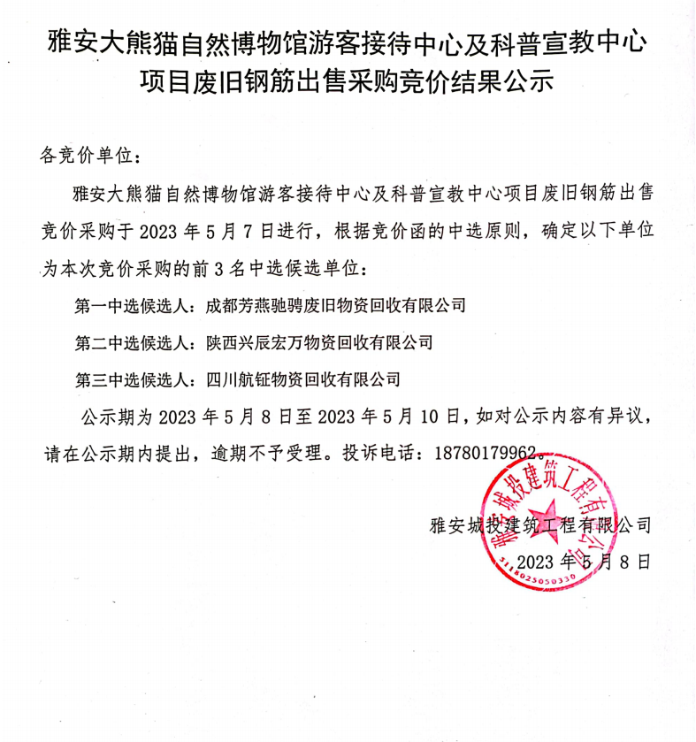 雅安大熊貓自然博物館游客接待中心及科普宣教中心項(xiàng)目廢舊鋼筋出售采購競價(jià)結(jié)果公示