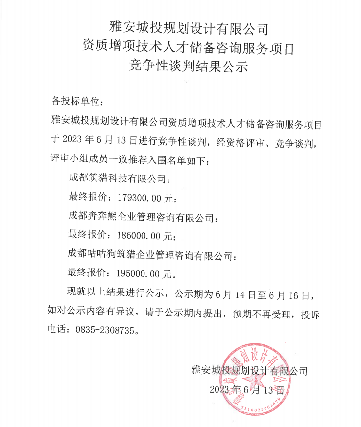 雅安城投規(guī)劃設(shè)計有限公司資質(zhì)增項技術(shù)人才儲備咨詢服務(wù)項目競爭性談判結(jié)果公示