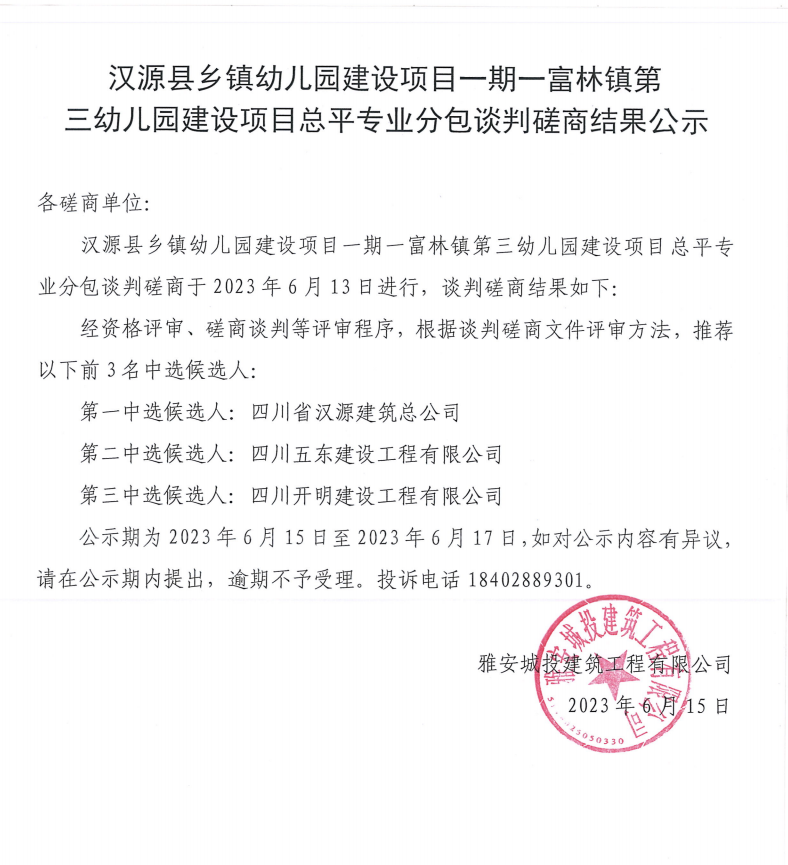 漢源縣鄉(xiāng)鎮(zhèn)幼兒園建設(shè)項目一期--富林鎮(zhèn)第三幼兒園建設(shè)項目總平專業(yè)分包談判磋商結(jié)果公示