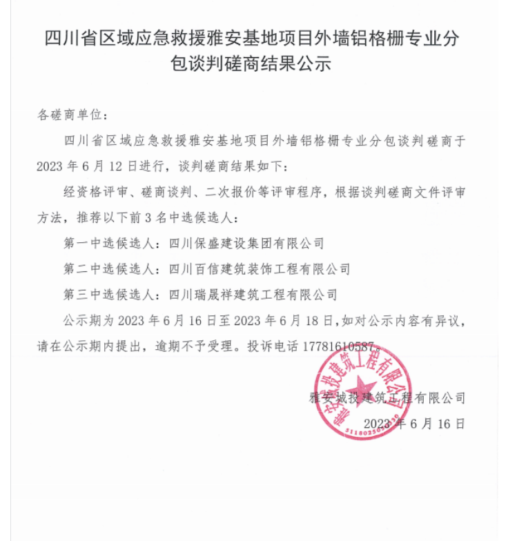 四川省區(qū)域應急救援雅安基地項目外墻鋁格柵專業(yè)分包談判磋商結(jié)果公示