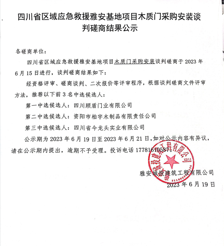 四川省區(qū)域應(yīng)急救援雅安基地項(xiàng)目木質(zhì)門采購(gòu)安裝談判磋商結(jié)果公示