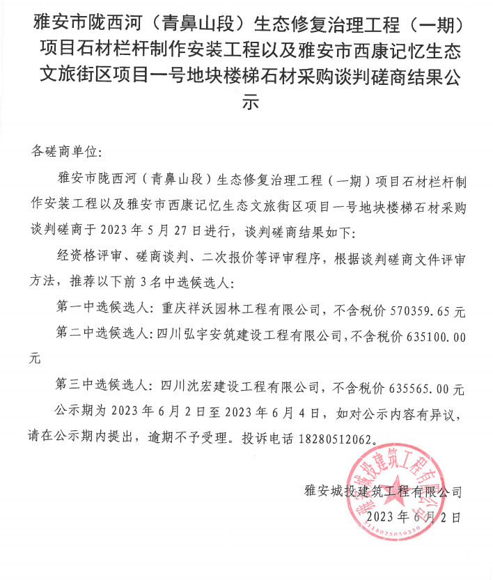 雅安市隴西河(青鼻山段)生態(tài)修復(fù)治理工程(一期)項目石材欄桿制作安裝工程以及雅安市西康記憶生態(tài)文旅街區(qū)項目一號地塊樓梯石材采購談判磋商結(jié)果公示