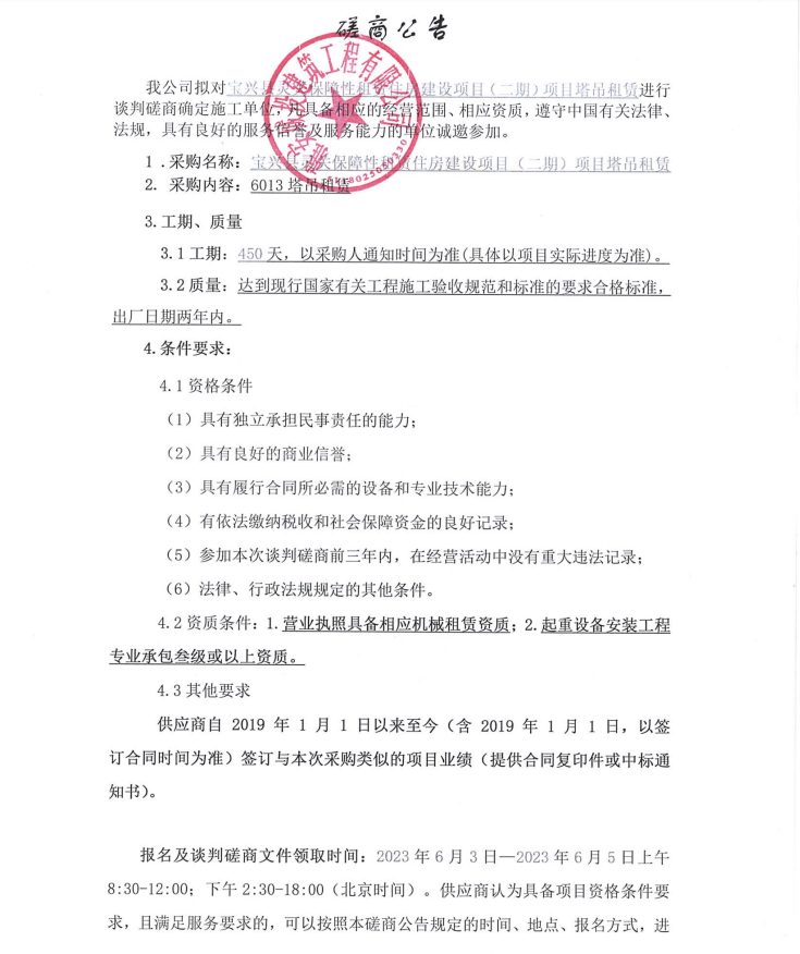 寶興縣靈關(guān)保障性租賃住房建設(shè)項(xiàng)目(二期)項(xiàng)目塔吊租賃談判磋商公告