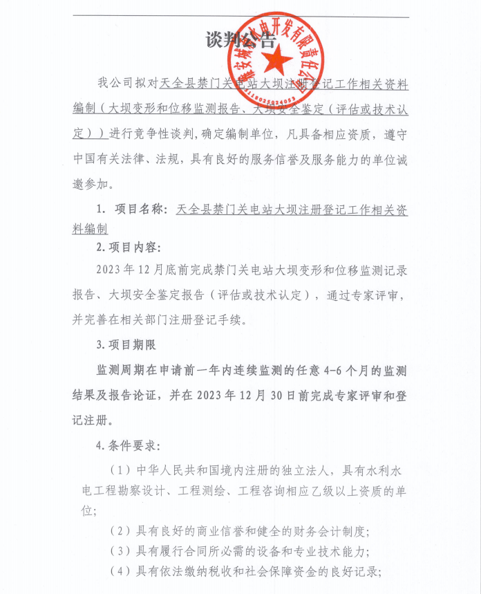 天全縣禁門關(guān)電站大壩注冊登記工作相關(guān)資料編制(大壩變形和位移監(jiān)測報(bào)告、大壩安全鑒定(評估或技術(shù)認(rèn)定))談判公告