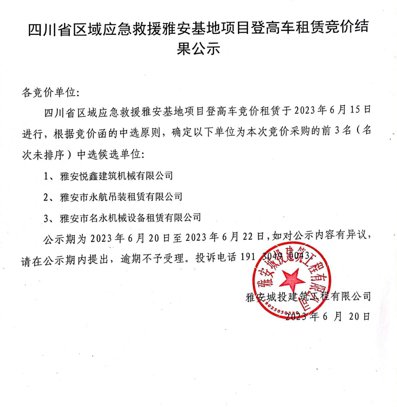 四川省區(qū)域應(yīng)急救援雅安基地項(xiàng)目登高車(chē)租賃競(jìng)價(jià)結(jié)果公示