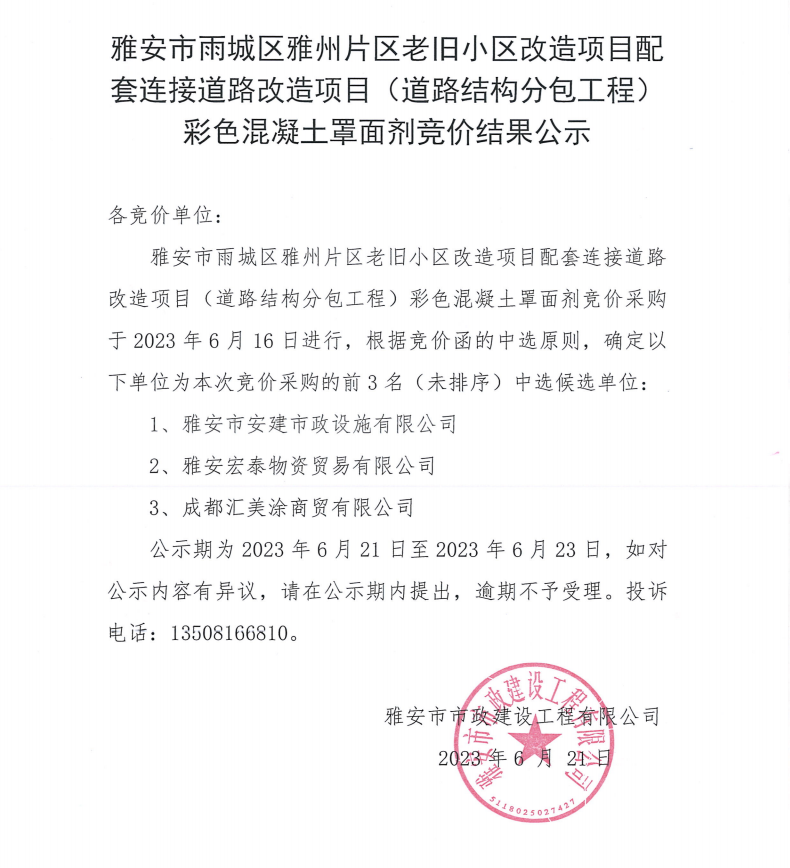 雅安市雨城區(qū)雅州片區(qū)老舊小區(qū)改造項(xiàng)目配套連接道路改造項(xiàng)目(道路結(jié)構(gòu)專業(yè)分包工程)彩色混凝土罩面劑競(jìng)價(jià)結(jié)果公示