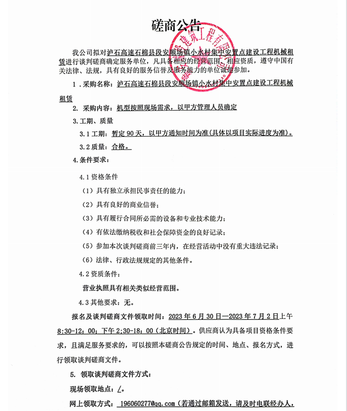 瀘石高速石棉縣段安順場(chǎng)鎮(zhèn)小水村集中安置點(diǎn)建設(shè)工程機(jī)械租賃談判磋商公告