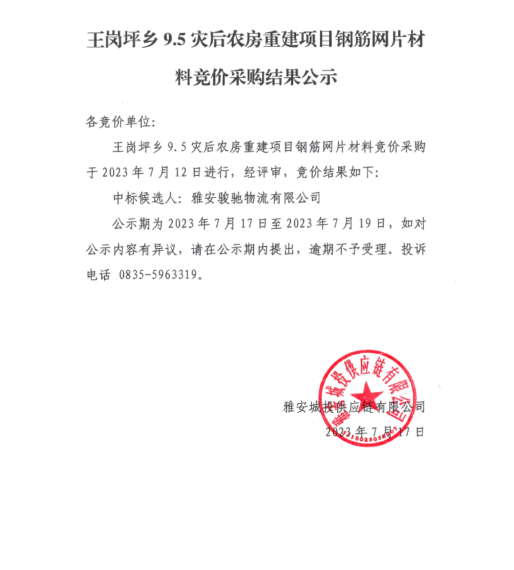 王崗坪鄉(xiāng)9.5災(zāi)后農(nóng)房重建項(xiàng)目鋼筋網(wǎng)片材料競價(jià)采購結(jié)果公示