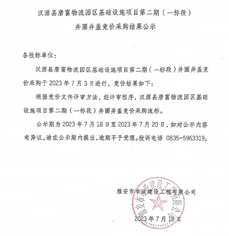 漢源縣唐富物流園區(qū)基礎(chǔ)設(shè)施項(xiàng)目第二期(一標(biāo)段)井圈井蓋競(jìng)價(jià)采購(gòu)結(jié)果公示