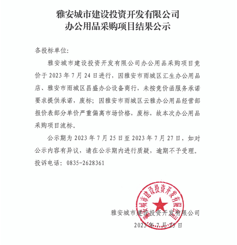 雅安城市建設(shè)投資開(kāi)發(fā)有限公司辦公用品采購(gòu)項(xiàng)目結(jié)果公示