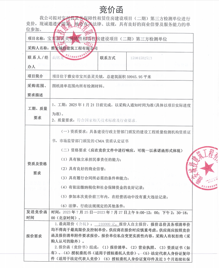 寶興縣靈關(guān)保障性租賃住房建設(shè)項(xiàng)目(二期)第三方檢測(cè)單位競價(jià)公告