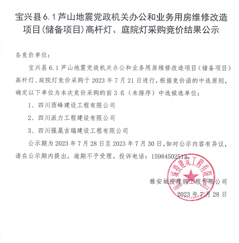 寶興縣6.1蘆山地震黨政機關辦公和業(yè)務用房維修改造項目(儲備項目)高桿燈、庭院燈采購競價結果公示