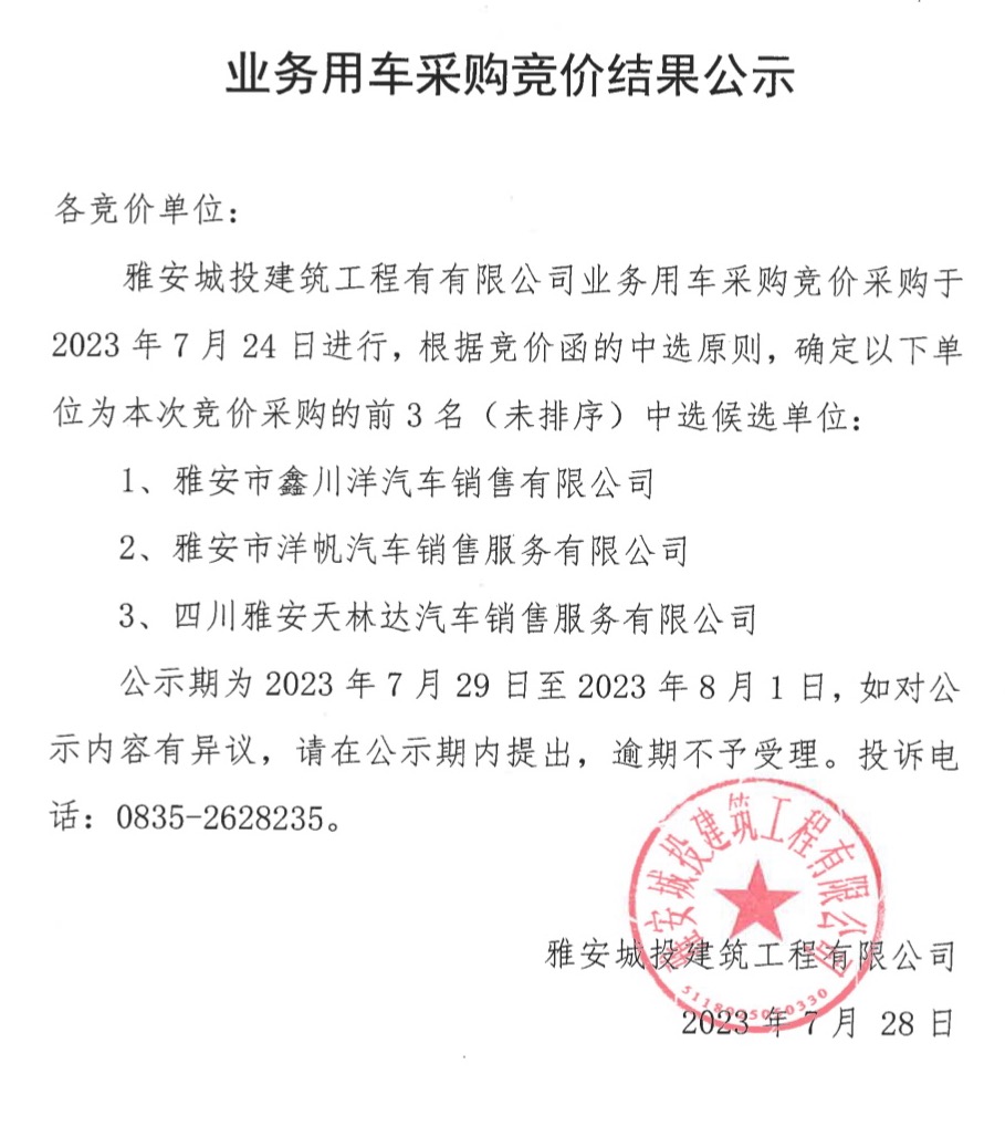業(yè)務(wù)用車采購(gòu)競(jìng)價(jià)結(jié)果公示