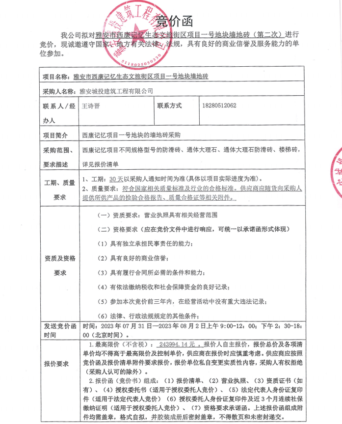 雅安市西康記憶生態(tài)文旅街區(qū)項(xiàng)目一號(hào)地塊墻地磚(第二次)競價(jià)采購公告