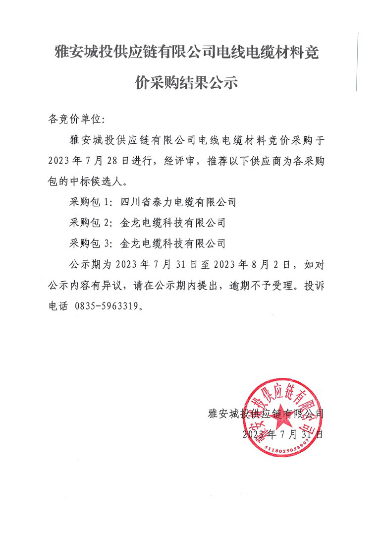 雅安城投供應(yīng)鏈有限公司電線電纜材料競(jìng)價(jià)采購(gòu)結(jié)果公示