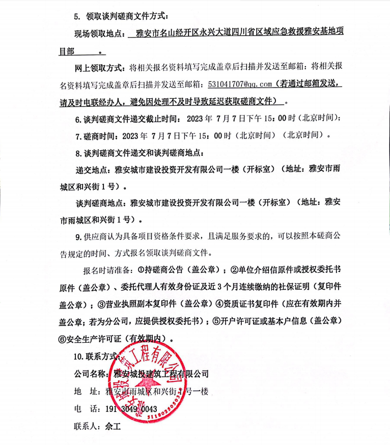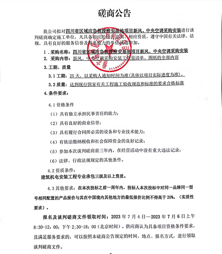四川省區(qū)域應(yīng)急救援雅安基地項目新風、中央空調(diào)采購安裝談判磋商公告