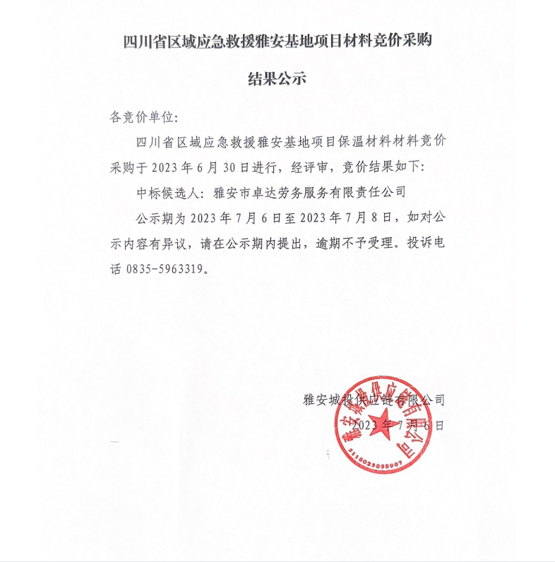 四川省區(qū)域應(yīng)急救援雅安基地項(xiàng)目材料競價采購結(jié)果公示