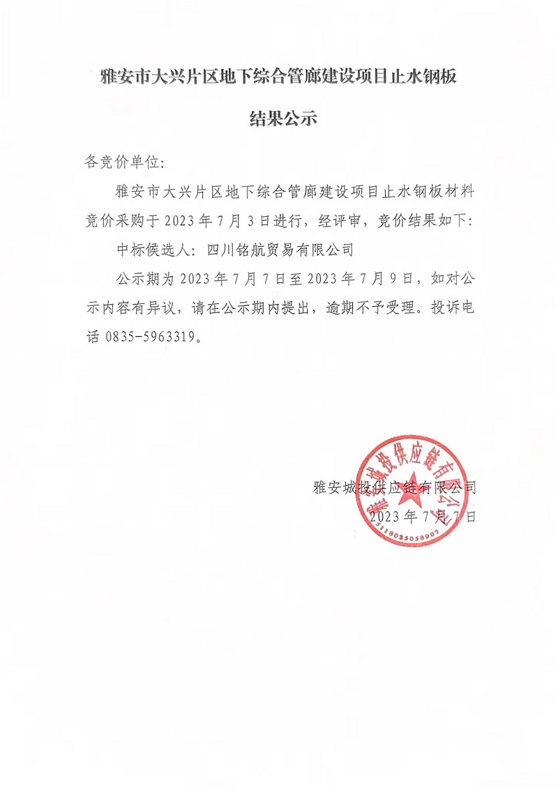 雅安市大興片區(qū)地下綜合管廊建設(shè)項(xiàng)目止水鋼板結(jié)果公示