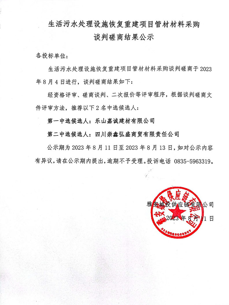 生活污水處理設施恢復重建項目管材材料采購談判磋商結果公示