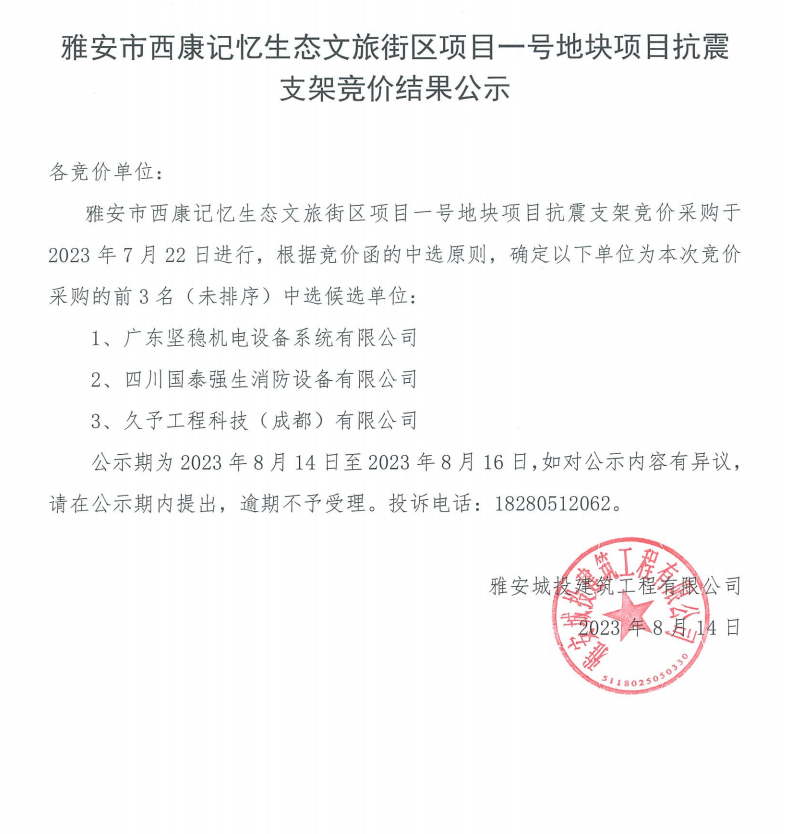 雅安市西康記憶生態(tài)文旅街區(qū)項(xiàng)目一號地塊項(xiàng)目抗震支架競價結(jié)果公示