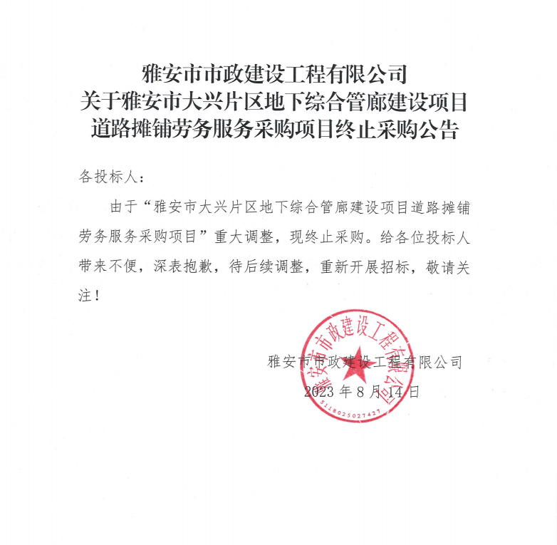 雅安市市政建設(shè)工程有限公司關(guān)于雅安市大興片區(qū)地下綜合管廊建設(shè)項(xiàng)目道路攤鋪勞務(wù)服務(wù)采購(gòu)項(xiàng)目終止采購(gòu)公告