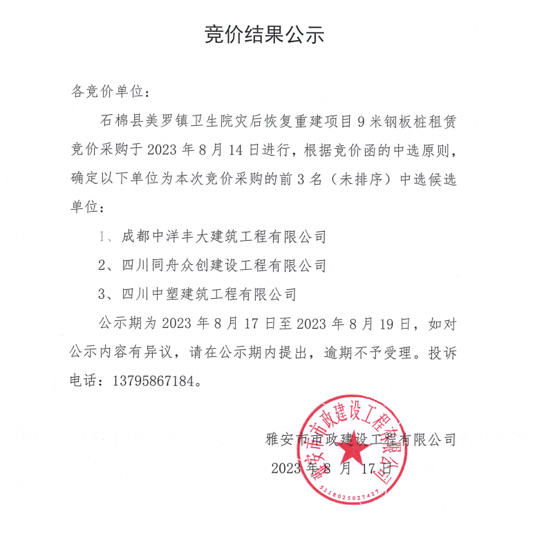 石棉縣美羅鎮(zhèn)衛(wèi)生院災后恢復重建項目9米鋼板樁租賃競價結果公示