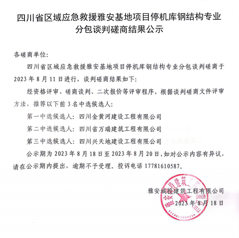 四川省區(qū)域應(yīng)急救援雅安基地項目停機(jī)庫鋼結(jié)構(gòu)專業(yè)分包談判磋商結(jié)果公示