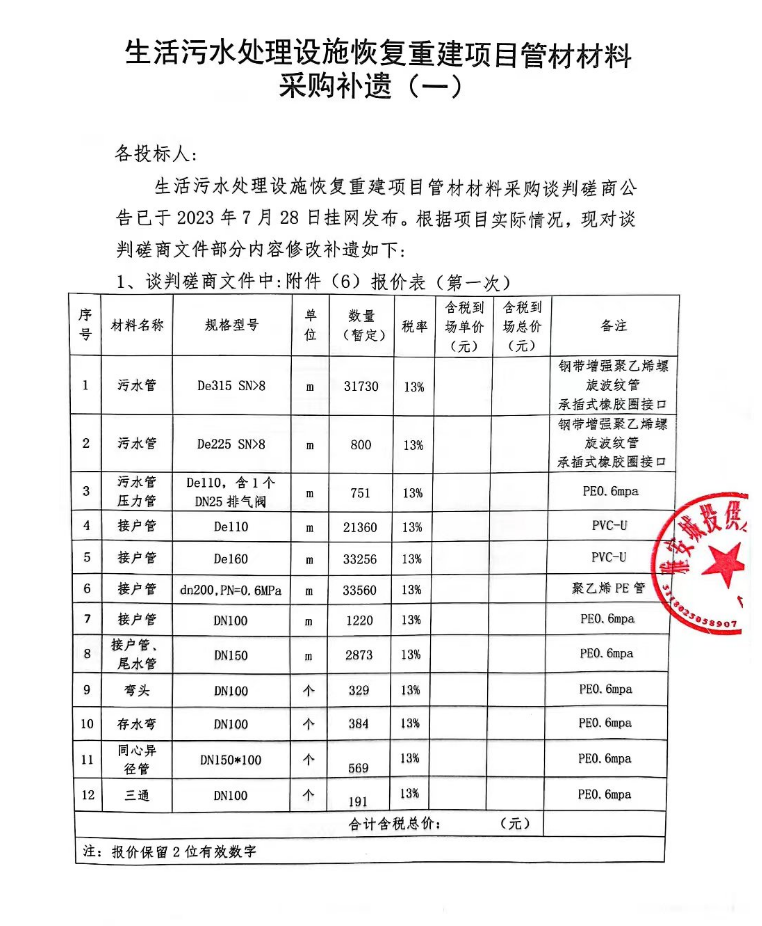 生活污水處理設(shè)施恢復(fù)重建項目管材材料采購補遺(一)