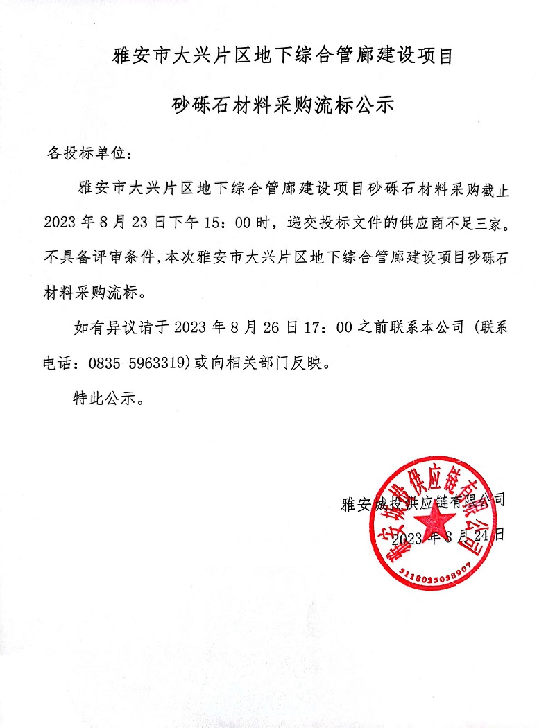 雅安市大興片區(qū)地下綜合管廊建設(shè)項目砂礫材料采購流標公示