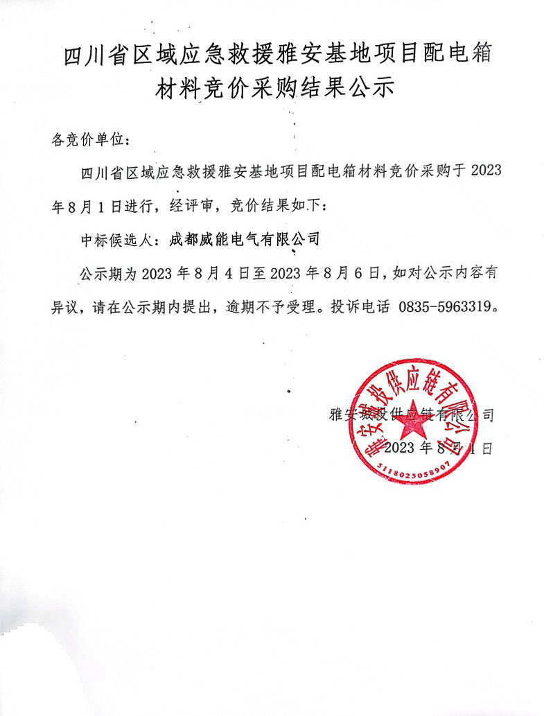 四川省區(qū)域應(yīng)急救援雅安基地項(xiàng)目配電箱材料競(jìng)價(jià)采購(gòu)結(jié)果公示