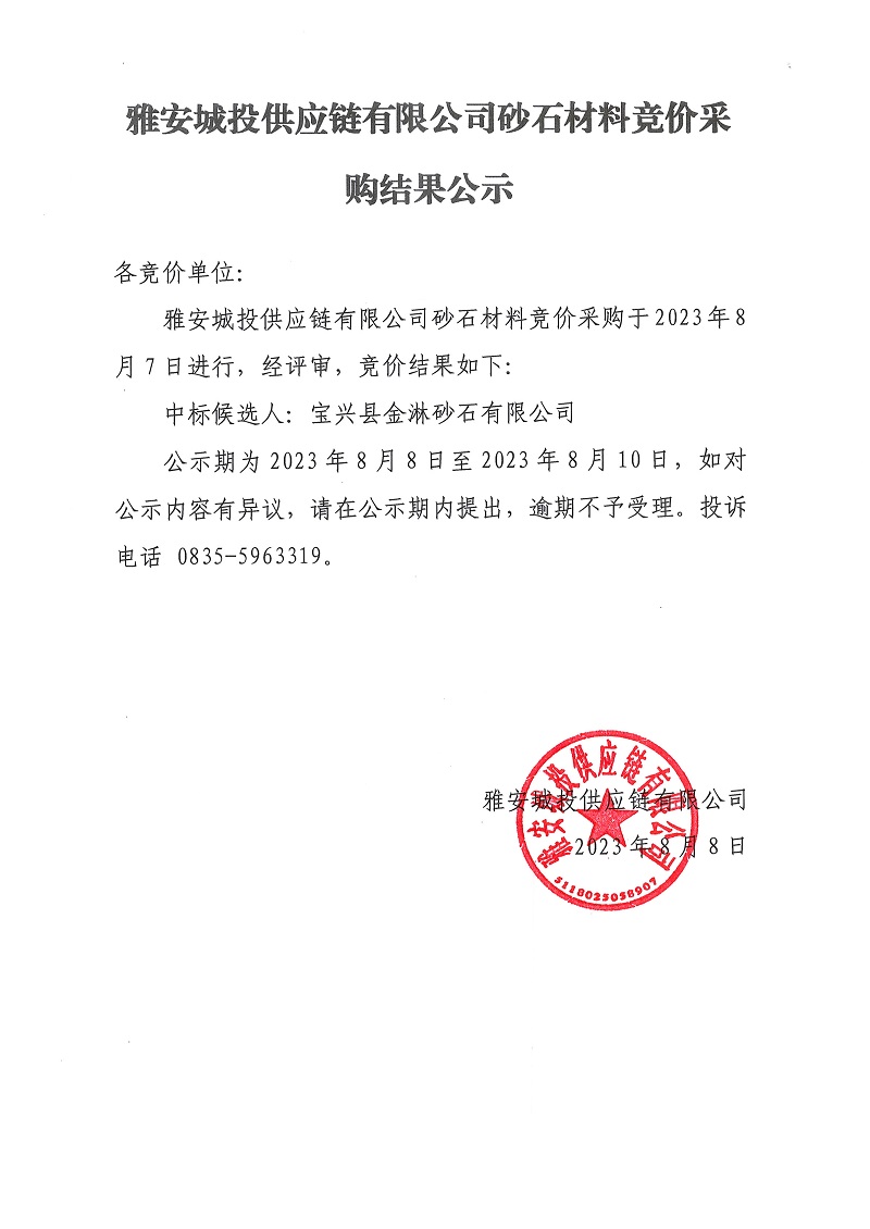 雅安城投供應(yīng)鏈有限公司砂石材料競(jìng)價(jià)采購(gòu)結(jié)果公示