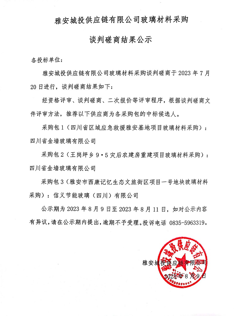 雅安城投供應(yīng)鏈有限公司玻璃材料采購談判磋商結(jié)果公示