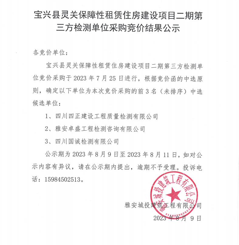 寶興縣靈關保障性租賃住房建設項目二期第三方檢測單位采購競價結(jié)果公示