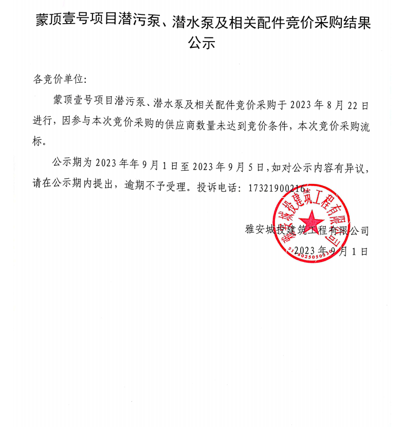 蒙頂壹號(hào)項(xiàng)目潛污泵、潛水泵及相關(guān)配件競價(jià)采購結(jié)果公示