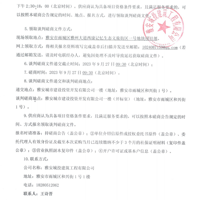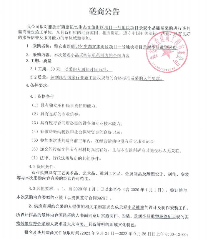 雅安市西康記憶生態(tài)文旅街區(qū)項(xiàng)目一號地塊項(xiàng)目景觀小品雕塑采購談判磋商公告